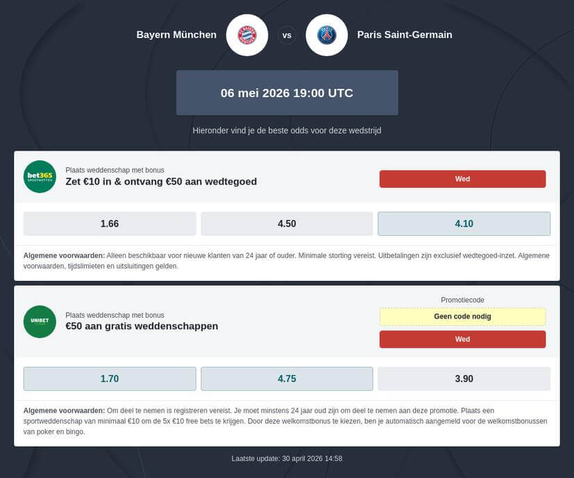 In deze return verdedigt PSG een minimale voorsprong, terwijl Bayern München de druk direct kan opvoeren met een vroege treffer. Maar dit agressief jagende Bayern kan daardoor kansen creëren voor PSG in de omschakeling. Deze dynamiek maakt weddenschappen op het aantal doelpunten of op beide teams scoren of een hoog aantal schoten op doel statistisch zeer interessant.